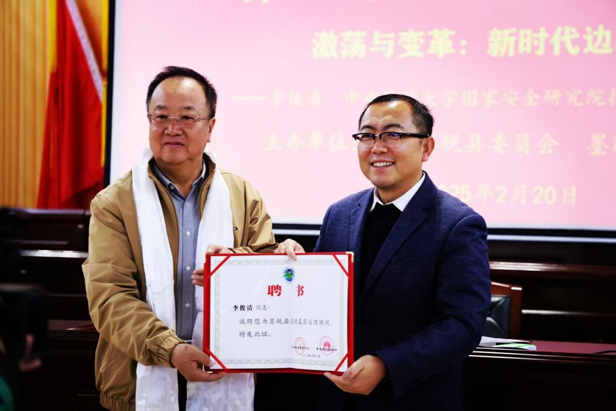 授课前,墨脱县委、县政府举行了聘请李俊清教授为“墨脱县边境基层治理顾问”的仪式,并颁发聘书。