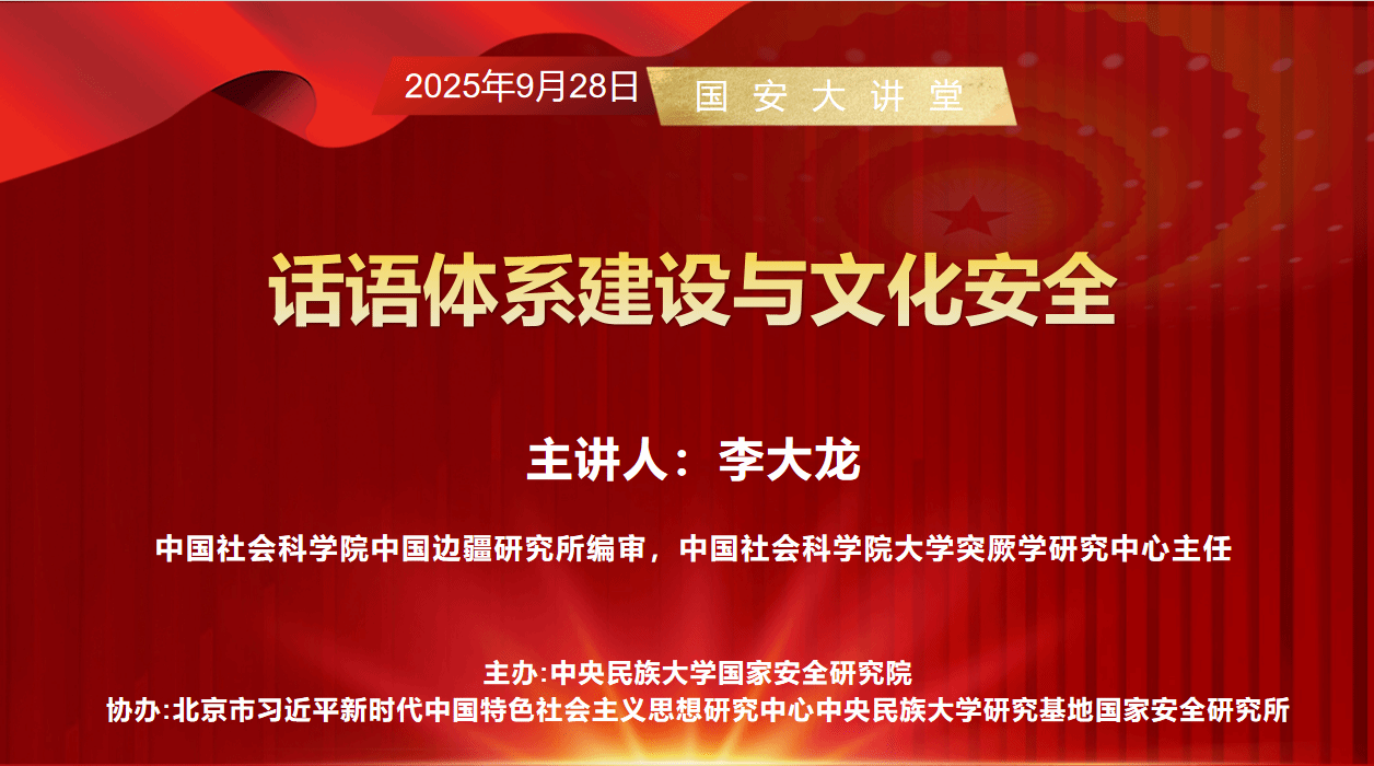 研究基地国家安全研究所协办的“国安大讲堂”2025年秋季学期第一次讲座在海淀校区成功举行。本期讲座特邀中国社会科学院中国边疆研究所编审、中国社会科学院大学突厥学研究中心主任李大龙教授主讲,开展题为“话语体系建设与文化安全”的专题报告。讲座由91吃瓜