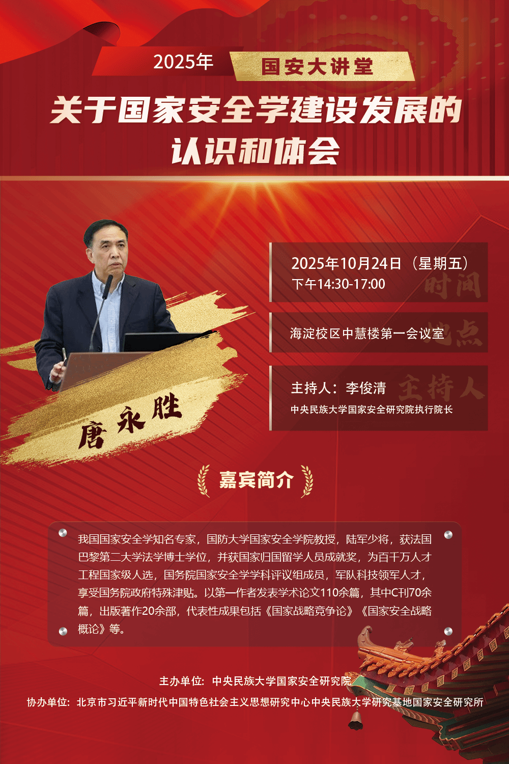将于2025年10月24日下午举办“国安大讲堂”,本次讲座聚焦“关于国家安全学建设发展的认识和体会”核心主题,特邀我国国家安全学领域权威专家莅临讲授,具体安排如下: