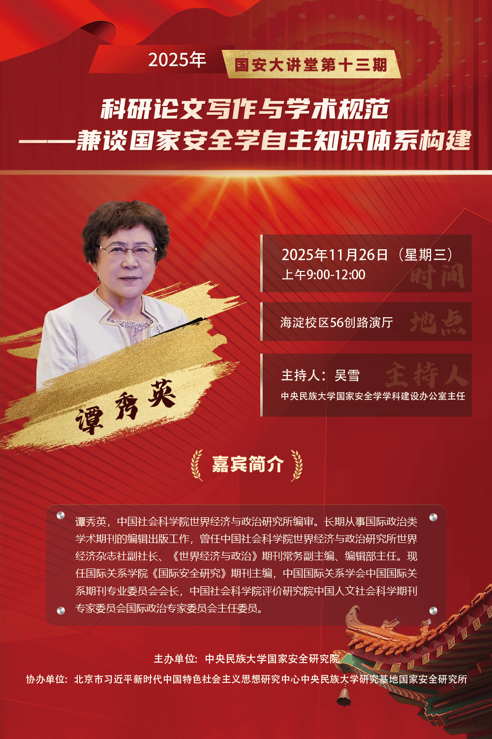 将于2025年11月26日举办“国安大讲堂”第十三期,具体安排如下: