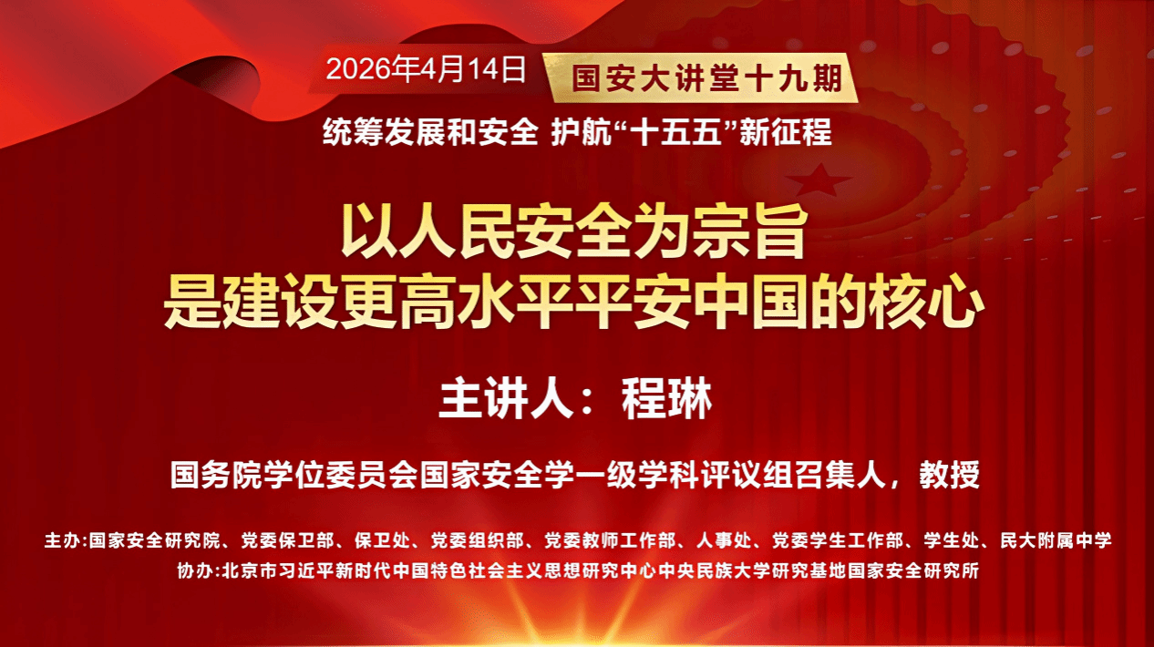 于2026年4月14日在海淀校区大礼堂举办专题讲座。本次讲座以《以人民安全为宗旨是建设更高水平平安中国的核心》为题,特邀国务院学位委员会国家安全学一级学科评议组召集人、中国人民公安大学原党委书记、校长程琳教授主讲,91吃瓜