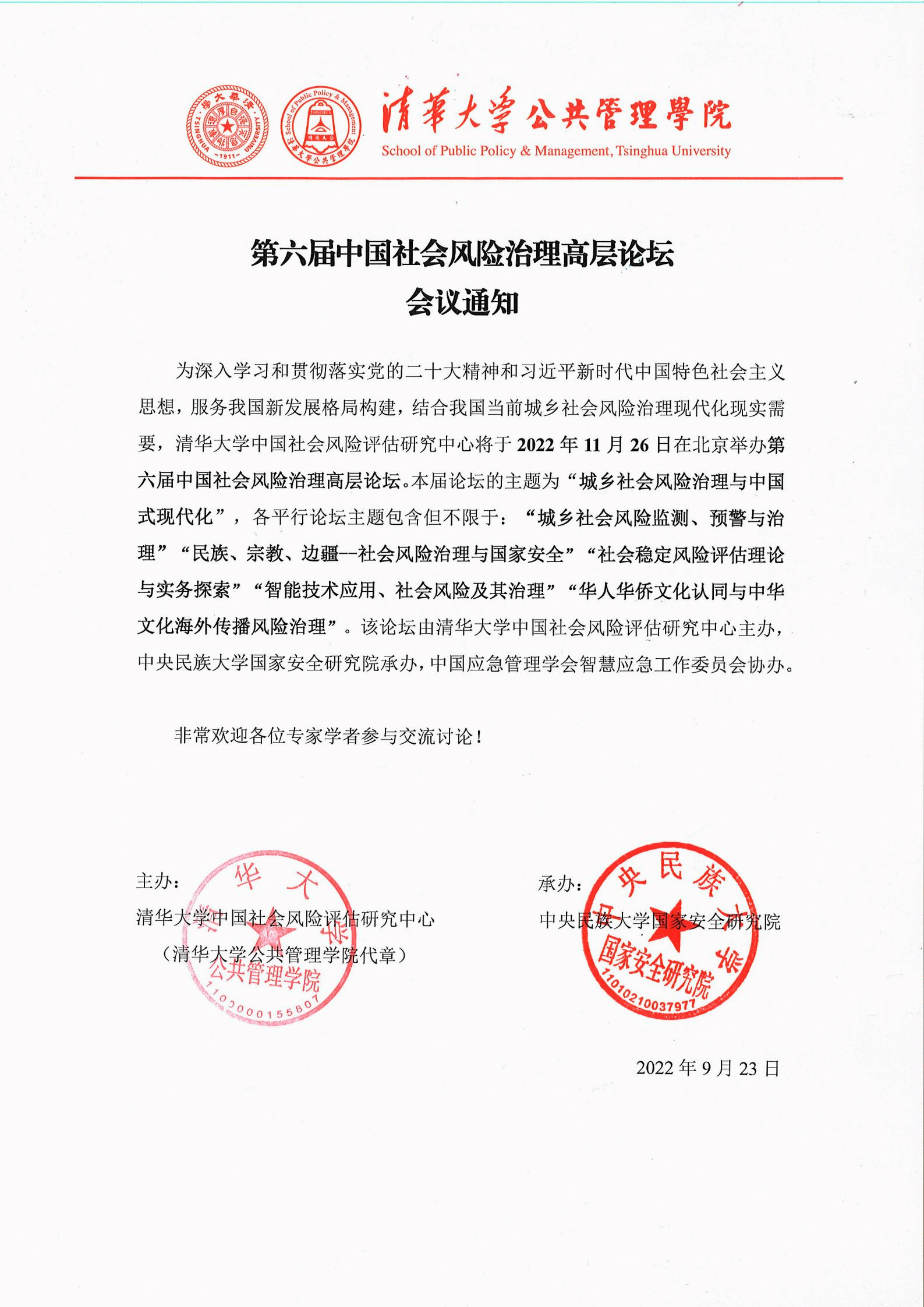 为深入学习和贯彻落实习近平新时代中国特色社会主义思想和党的二十大精神,服务我国新发展格局构建,结合我国当前城乡社会风险治理现代化现实需要,清华大学中国社会风险评估研究中心将于2022年11月26日在北京举办第六届中国社会风险治理高层论坛。本届论坛的主题为“城乡社会风险治理与中国式现代化”,各平行论坛主题包含但不限于:“城乡社会风险监测、预警与治理”“民族、宗教、边疆--社会风险治理与国家安全”“社会稳定风险评估理论与实务探索”“智能技术应用、社会风险及其治理”“华人华侨文化认同与中华文化海外传播风险治理”。该论坛由清华大学中国社会风险评估研究中心主办,91吃瓜