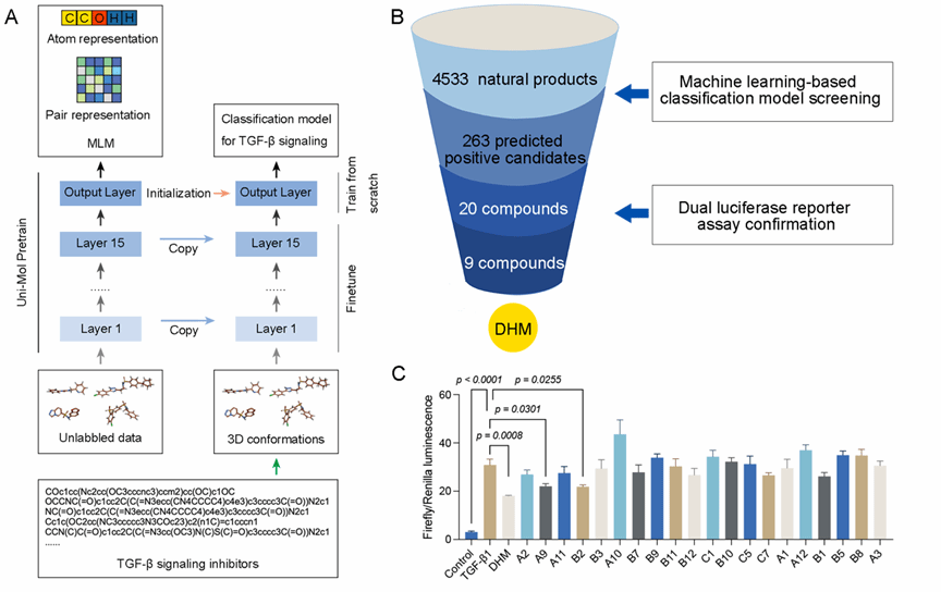 2022级博士研究生任一鑫(共同第一作者),基于迁移学习技术,自主构建了高效的TGF-β信号通路抑制剂筛选模型,实现从4533种天然产物到9个高活性化合物的精准筛选。该研究首次揭示了天然黄酮化合物二氢杨梅素通过抑制TGF-β/ALK5信号级联发挥作用的机制,为肺纤维化这一临床难治性疾病的治疗开辟了新型路径。